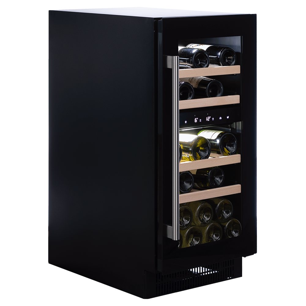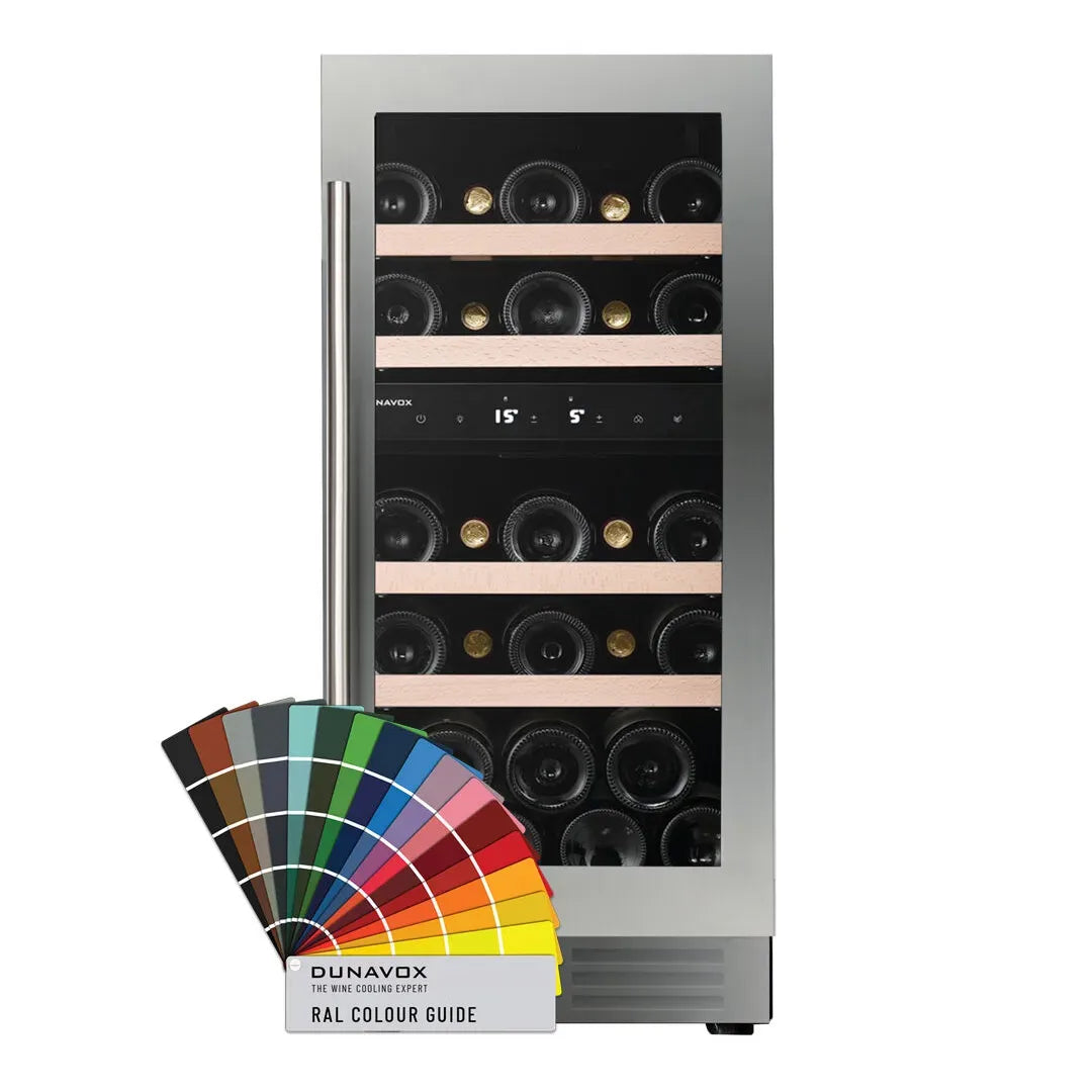 De Flow-32D biedt plaats aan 32 Bordeauxflessen (0,75 L) verdeeld over twee afzonderlijke temperatuurzones. De bovenste zone is instelbaar van 10-18 °C en de onderste zone van 5-10 °C, zodat rode en witte wijnen altijd op hun ideale serveertemperatuur bewaard worden.