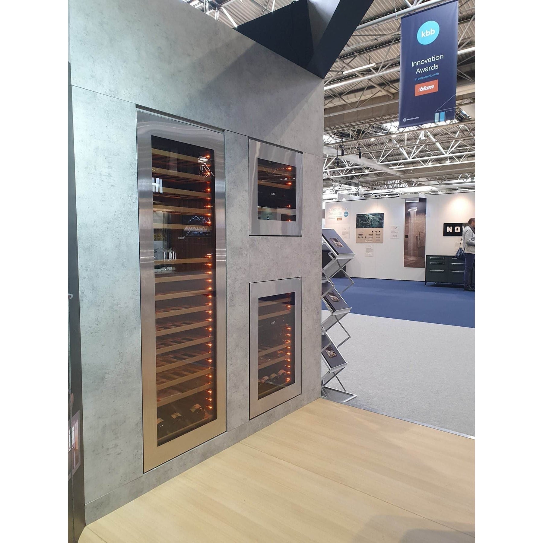 Dit model onderscheidt zich door zijn strakke, moderne uitstraling. De greeploze deur opent met de Push2Open technologie: één lichte druk en de deur opent automatisch. Een uniek kenmerk is de mogelijkheid om de deurlijst aan te passen aan de kleur van uw keuze, zodat de wijnkast perfect aansluit bij uw keuken. Het interieur is voorzien van houten leggers en LED-verlichting in wit, blauw of oranje, waardoor uw collectie altijd stijlvol wordt gepresenteerd. Dankzij de diepe plint is de wijnkast eenvoudig in te bouwen in elke keukenwand.