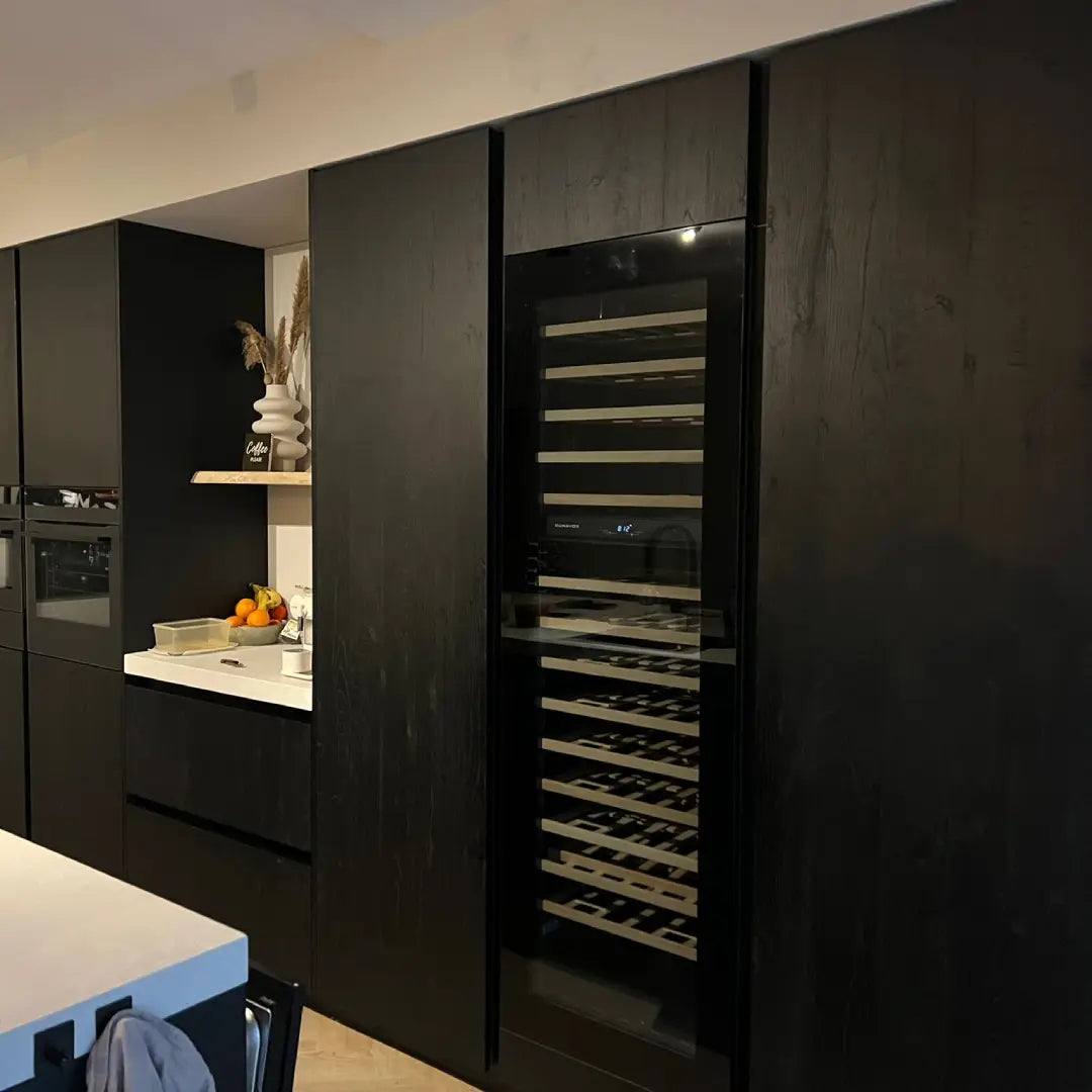 Dit model heeft een minimalistische deur die opent met één lichte druk. Binnenin is de wijnkoelkast voorzien van telescopische houten legplanken, meerdere LED-verlichtingskleuren en een TFT-display voor intuïtieve controle. WiFi-connectiviteit geeft toegang tot temperatuurbeheer en waarschuwingen via een app. Door het geïntegreerde ventilatiesysteem is inbouw eenvoudig en visueel naadloos, perfect passend in moderne interieurs.