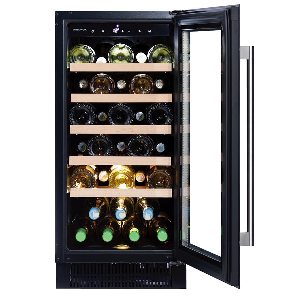 De Dunavox Flow-32 (modelnummer DAUF-32.83MB) is een stijlvolle onderbouw wijnkoelkast in mat zwart met een enkele temperatuurzone en een capaciteit van 32 flessen. Dit model is ontworpen voor moderne keukens en combineert elegantie met functionaliteit, geschikt voor zowel inbouw onder het aanrecht als vrijstaand gebruik.
