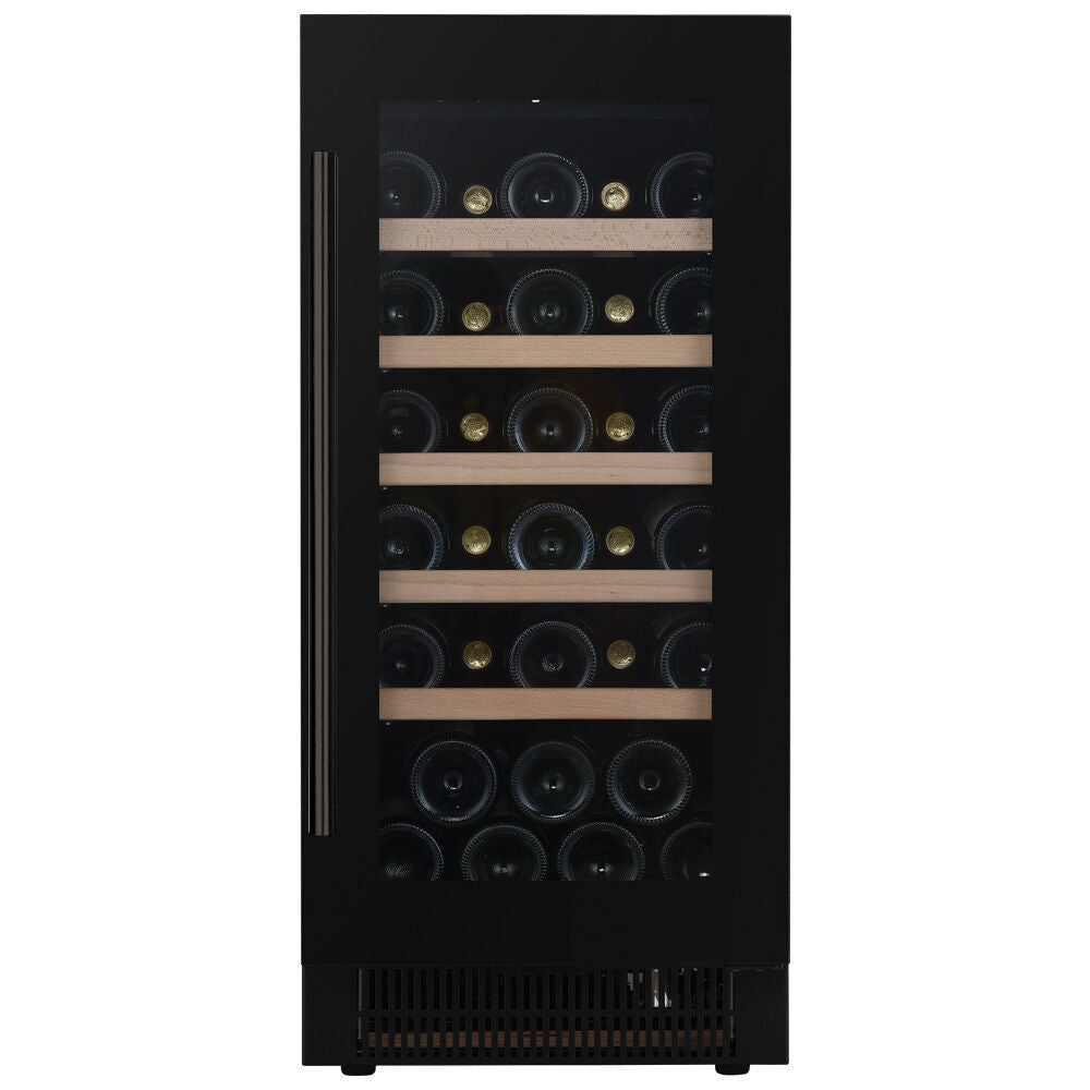 De Flow-32 in mat zwart heeft een roestvrijstalen handgreep en stevige houten leggers. De flessen worden verlicht met multi-LED verlichting in wit, amber of blauw. Het LED-touchscreen maakt het eenvoudig om de temperatuur te bedienen, instelbaar van 5 tot 18°C, en geeft de koelkast een moderne, strakke uitstraling.