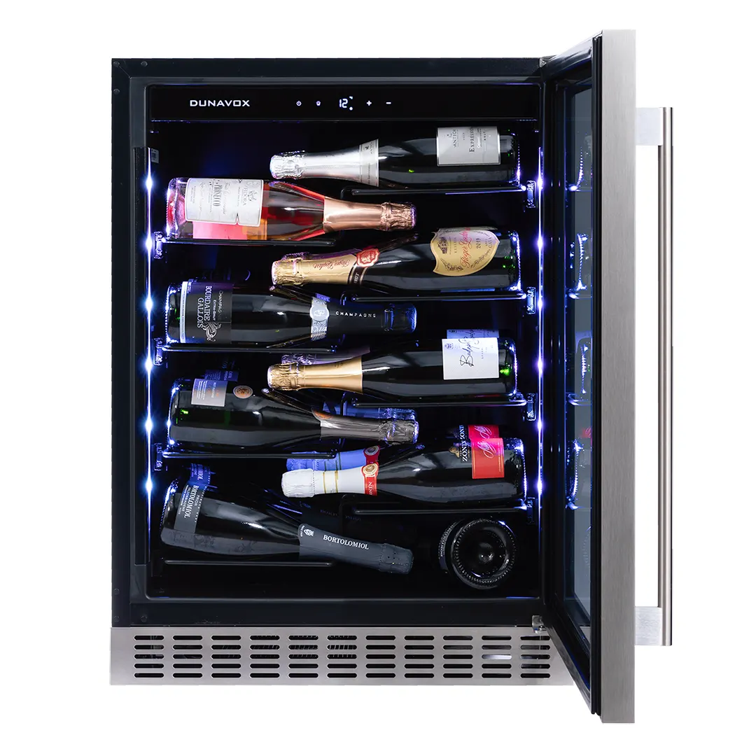 De Dunavox Sera‑40 (DAUF‑40.138MB) is een inbouw wijnkoelkast met één temperatuurzone, ontworpen voor onder het aanrecht. De wijnkoelkast is geschikt voor het bewaren en presenteren van grotere flessen zoals champagne of prosecco. Met een capaciteit van 40 flessen, een geluidsniveau van slechts 38 dB en een energieverbruik van 83 kWh per jaar, is dit model stil en energiezuinig. De afmetingen zijn 81,3 cm hoog, 59,5 cm breed en 57 cm diep.