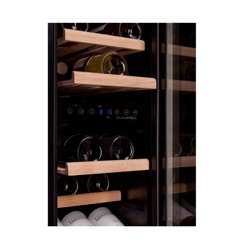 De Dunavox DAUF-32.78DSS heeft een totale opslagcapaciteit van 32 flessen verdeeld over twee temperatuurzones. Het bovenste gedeelte van de kast heeft een temperatuurbereik van 10 °C tot 18 °C en biedt ruimte aan maximaal 15 flessen, ideaal voor witte wijnen. Het onderste gedeelte heeft een temperatuurbereik van 5 °C tot 10 °C en kan maximaal 17 flessen bevatten, geschikt voor rode wijnen. De temperatuur van beide zones is afzonderlijk instelbaar via een elektronische regeling, en de flessen liggen horizontaal op uitschuifbare houten lades.